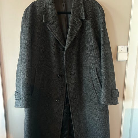 Vintage Blystad frakk for herre i størrelse 52. I meget god stand. Klassisk, enkelspent modell med krage og knapping foran. Frakken er i mørk grå ullblanding (55 % ren ull / 45 % ullblanding ifølge merkelapp) med vattert innside for ekstra isolasjon. Lengden går ned mot knærne, og plagget har sidelommer. Egnet som ytterjakke i kjøligere vær og til både hverdags- og penbruk.