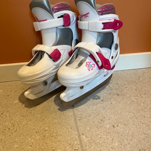 Bladerunner justerbare skøyter i str 30-33 for barn i blå og hvit farge. Modellen har myk, polstret innersko og ytre skall med spenner og borrelås for stabilitet og støtte rundt ankelen.