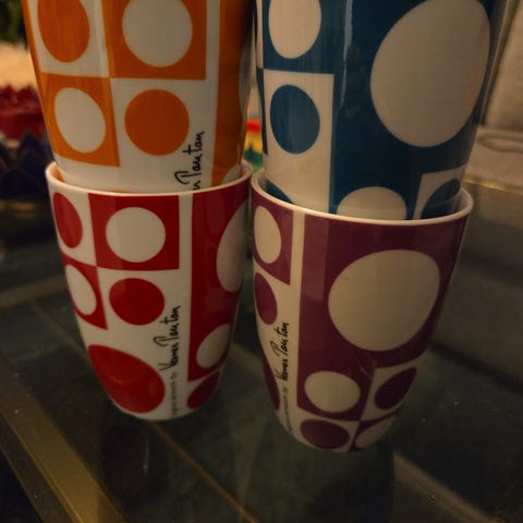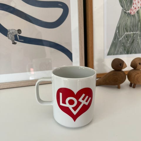 Pent brukt Design letters porselenskopp med bokstaven P. Typografi designet av Arne Jacobsen. Har blitt brukt som penneholder her. Ø: 8 cm, h: 8,5 cm.