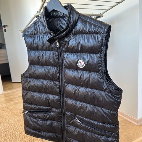 Moncler Longue Saison dunvest for herre i størrelse M. Vesten er grønn og har glansfull overflate med horisontale quiltesømmer. Fylt med dun for lett isolasjon. Modellen har ståkrage, glidelåslukking foran og to glidelåslommer i siden. Moncler-logo på brystet og Longue Saison-merkelapp på innsiden. Passer som ytterlag på milde dager eller som mellomlag under jakke i kaldere vær. Fargen er militær grønn og str 2( M) . Original autentisitetskode -certilogo"-kode på vesten.