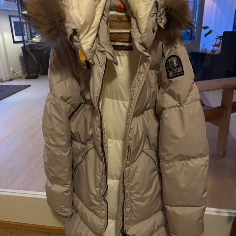 Parajumpers dunjakke for dame i størrelse S. Jakken er beige og fylt med dun. Modellen har hette med pelskant, flere utvendige lommer og karakteristiske detaljer som gul stropp og merke på ermet. Egnet som yttertøy på kalde dager.