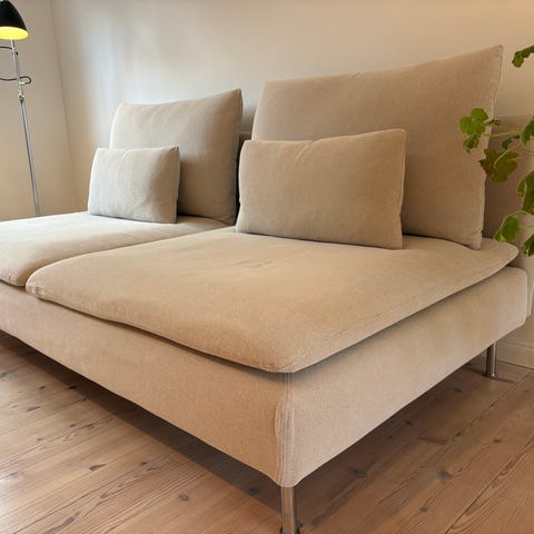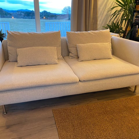 Söderhamn sofa med lysegult trekk selges. Ingen synlig slitasje da den kun er brukt som en ekstra sofa. Mørk grå trekk medfølger og her er den ene glidelåsen ødelagt.