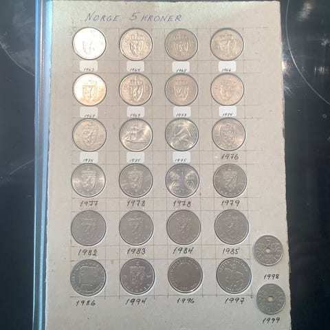 Norges Bank 10-kroner mynter fra årene mellom 1983 og 1991. Myntene er plassert i et ark med påskrevne årstall for hver enkelt mynt. Dette er en serie norske sirkulasjonsmynter som kan egne seg som grunnlag for en samling av 10-kroner fra 1980-tallet og begynnelsen av 1990-tallet, eller som supplement til eksisterende myntsamling.