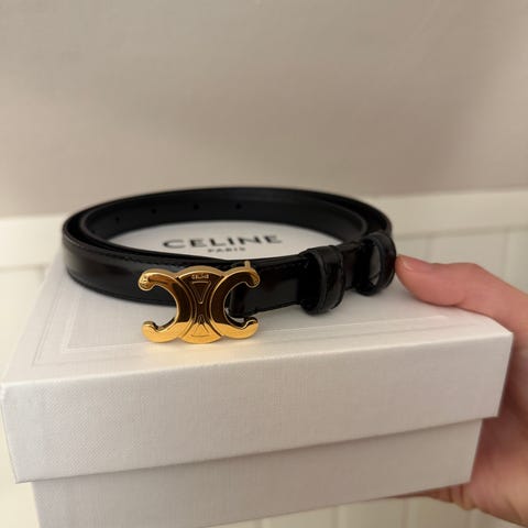 Celine Triomphe belte for dame i svart skinn. Beltet har gullfarget Triomphe-spenne i metall. Leveres med original eske og dustbag som vist på bildene. Passer til bruk i bukser, skjørt eller kjoler der man ønsker et klassisk skinnbelte med dekorativ spenne.