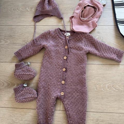 Name it ulldress i str 62 med tilhørende lue og tøfler. Dressen er godt brukt or har litt løse tråder osv, men funker fint fordet. Tøfflene og lua er like fine som nye. Selges samlet for 200 kr. Har også noen lille name it ullvotter som kan følge med, se siste bilde der datteren min har de på.