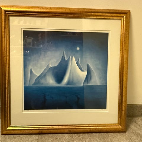 Like pent, klart til å henges opp. "Trollslottet"av Vebjørn Sand med ramme i fargen gull. Str: 45x40 cm.