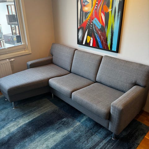 Godt brukt grå 3/4-seters sofa med sjeselong.