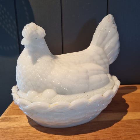 Vintage opal glass, høne på rede.