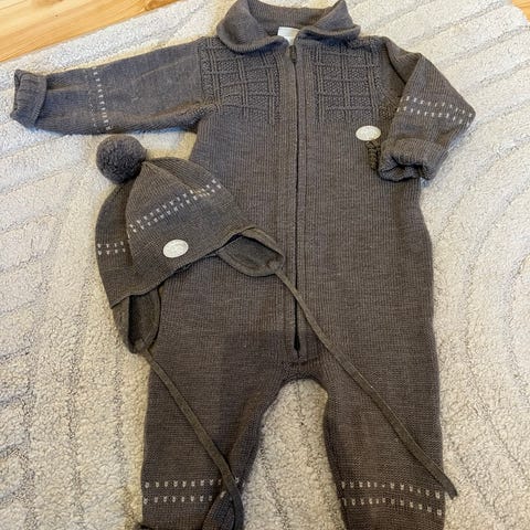 HUTTEliHUT Lue str 0-1 jeg brukte det til ungen var 3 år. Ulldress Merke Name IT. i størrelse 92 for unisex barn. Dressen er brun med mønster på overdel og er laget i ull. Den har lange ermer og ben, samt glidelås foran for enkel av- og påkledning. Egnet som varm og myk heldress til hverdagsbruk eller som lag under yttertøy i kjøligere vær.