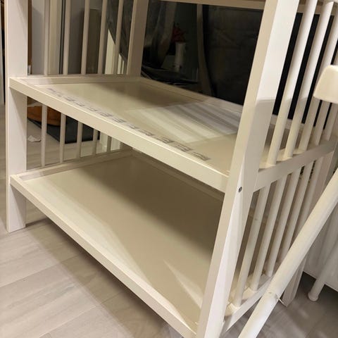Praktisk og solid stellebord fra IKEA i hvit utførelse. Stellebordet har to åpne hyller under stelleflaten med god plass til oppbevaring av bleier, klær og annet babyutstyr. Åpen gitterkonstruksjon på sidene gir god oversikt og luftig følelse rundt stelleplassen.