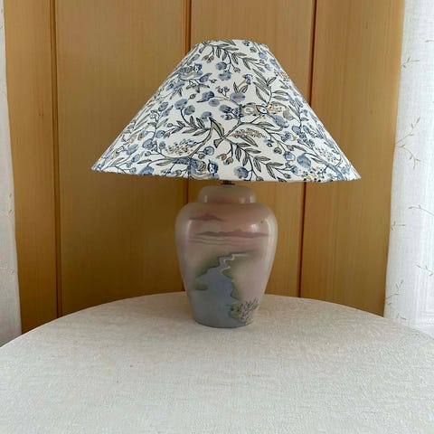 Keramikklampe med gullmotiv med håndlaget skjerm i papir fra Studio Bazar