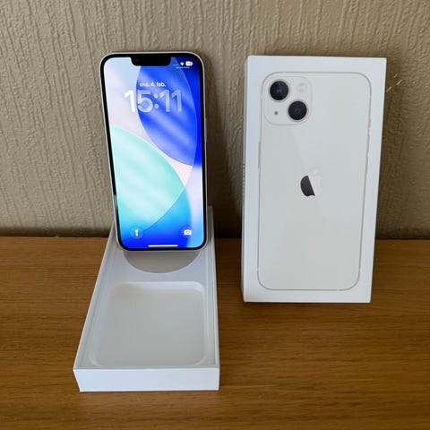Blå iPhone 13 128GB med ny lader, selges grunnet overgang til ny mobil.