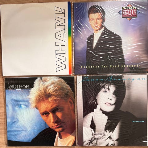 Samling med flere LP-plater fra ulike artister. Blant platene på bildene er albumet «Bad» av Michael Jackson, singelutgivelse av Tina Turner «We Don’t Need Another Hero (Thunderdome)», en bildeplate med Mandy Smith samt LP-plater med Tina Turner, blant annet «Foreign Affair» og et album med tittel «Break Every Rule». Passer for den som ønsker å utvide samlingen av pop- og rockutgivelser på vinyl fra 1980-tallet.