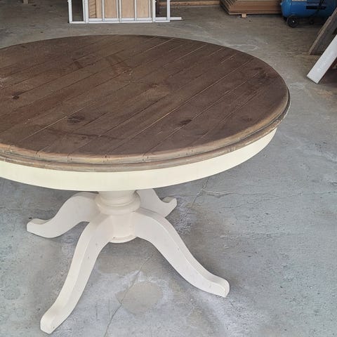 Rundt massivt spisebord selges billig kan dras ut så ligger det ileggsplate under. Trenger littegrann kjærlighet på toppen men enkelt å fikse med et malingstrøk☺️