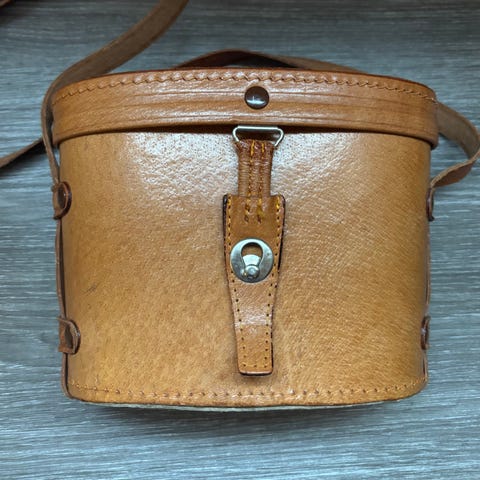 Brun veske i lær. Vesken har klaff med stropp og spenne for lukking, samt justerbar rem. Innvendig er det ett hovedrom. Utsiden har påført tekst og et nummer. Egner seg som liten veske eller oppbevaringsetui til hest.