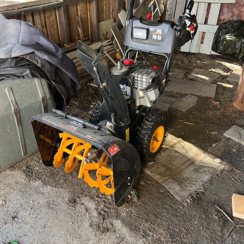 Biltema Snow Thrower ST 11001 snøfreser med 11 hk bensinmotor fra Zongshen. Tofaset freser med innmaterskrue og utkaster i front. Maskinen har grovmønstrede hjul for bedre fremkommelighet på snø og is, samt arbeidslys foran for bruk i mørke forhold. Egnet for rydding av innkjørsler, gårdsplasser og andre uteområder med moderat til kraftig snøfall. Startet på første taket etter ett år uten å ha vært startet. Det er en vaier som må byttes, men dette er kun for opp/ned regulering av tuten. Dette kan ses på de tre siste bildene. Alt annet virker som det skal. Det er byttet nye reimer til innmatningsskruen. Det er både snorstart og elektrisk start til 230V.