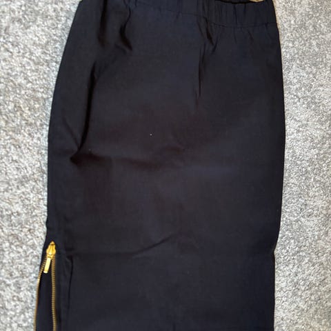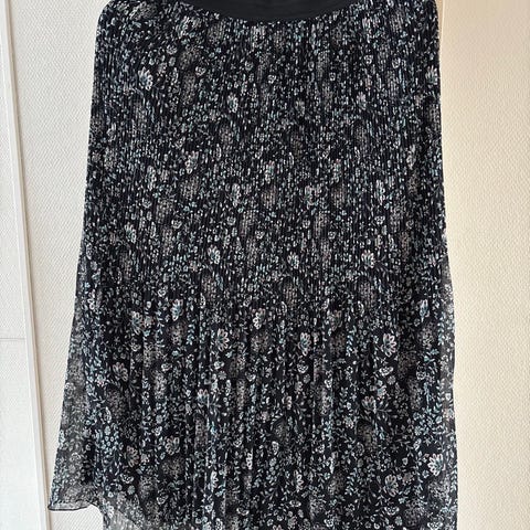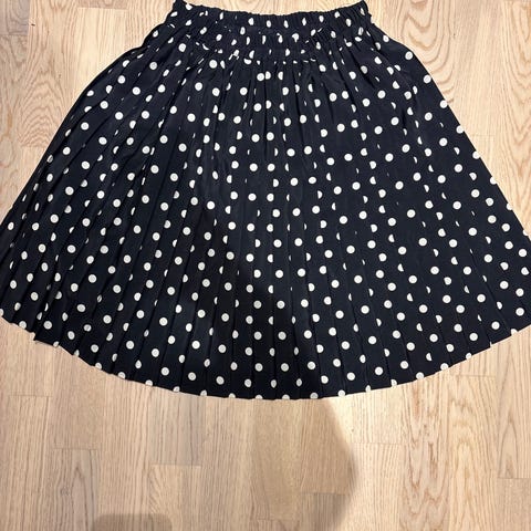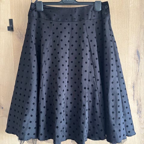 Pent foret plisséskjørt med lys beige prikker mot sort bakgrunn. Sateng kantbånd i livet. Lukkes med glidelås og knapp i siden.