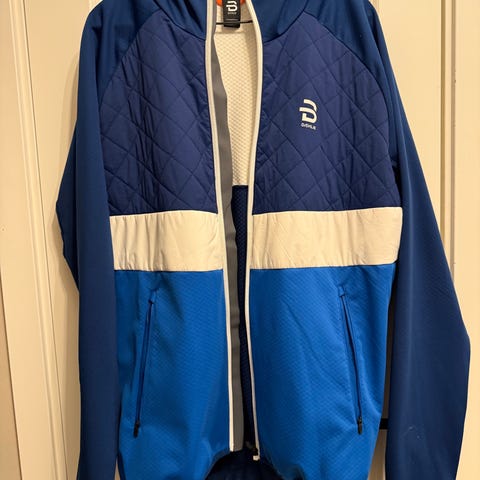 Dæhlie junior jakke med hette i størrelse 152. Jakken er i lyseblå og hvit farge med glidelås i front. Den har hette, mykt og mønstret innvendig fôr samt lett vattert frontparti. Refleksdetaljer på ermer og rygg, samt justering nederst. Litt varmere langrennsjakke.