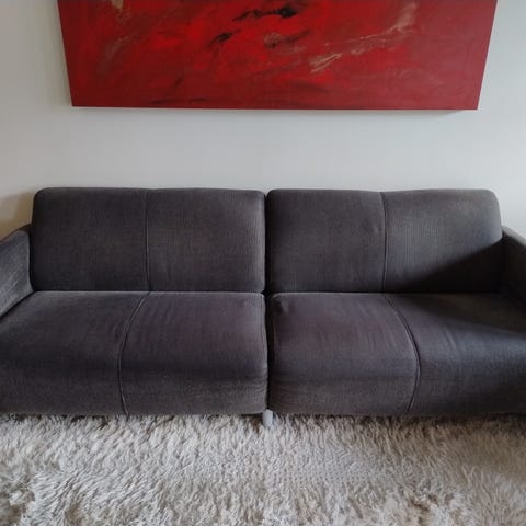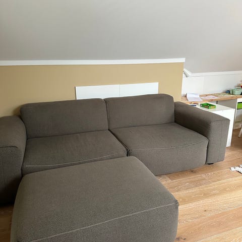 Vi skal flytte og selger derfor vår sofa og puff. De er ikke samme merke, men passer godt sammen. Puffen er fra Bolia, men usikker hvilket merke sofaen er.