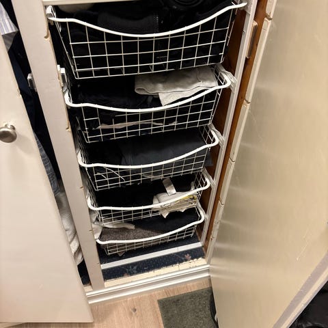 Elfa trådkurv i hvitlakkert metall med bredde 43 cm. Kurvene er egnet til oppbevaring i garderobe, bod eller andre oppbevaringsløsninger hvor Elfa-system brukes. Åpen trådkonstruksjon gir god oversikt og lufting av innholdet.
