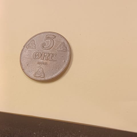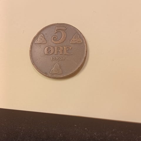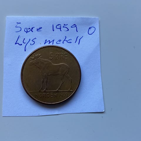 Norge 5 øre mynt i metall. Mynten har noe rust, men lite bruksslitasje, se bilder for tilstand. Kjøper står for porto.