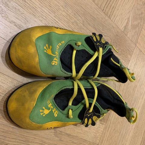 Black Diamond klatresko modell Momentum med borrelås i grå og svart. Skoene har to brede borrelåsstropper for enkel justering og av/på, samt gummisåle som dekker store deler av oversiden og tåpartiet for godt friksjonsgrep på klatreflater. Overdelen er i tekstil med forsterkninger i gummi rundt tå og hæl. Egner seg til innendørs og utendørs klatring og buldring. Størrelse 39,5, men små i størrelsen. Brukt av et barn i ett år.