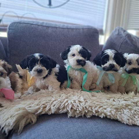 Mammo hennes er blanding av Lhasa Apso og havanais og veg ca 7 kg og pappa er reinraset havanais på ca 5-6 kg .