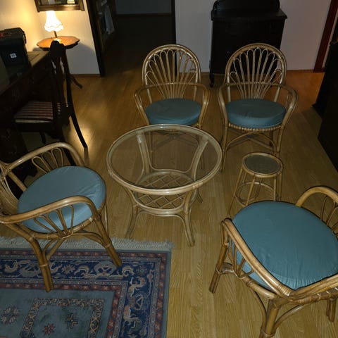 Hagemøbler i bambus som trenger en god skrubb. Veldig koselig sett med to sammenleggbare stoler og et bord med glassplate, ca 60cm høyt. Må hentes på Grünerløkka.