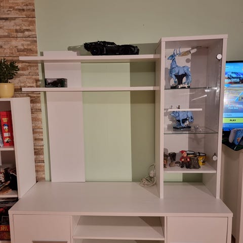 God og romslig seksjon m god plass til oppbevaring og pyntegjenstander. Skuffer i stoff følger med.
