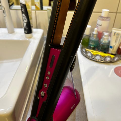 Rettetangen har fleksible plater som samler håret for jevn varmefordeling. Flere temperaturinnstillinger vises med lysindikatorer på innsiden av håndtaket. Modellen kan brukes med ledning, og medfølgende lader/strømadapter følger med på bildene.