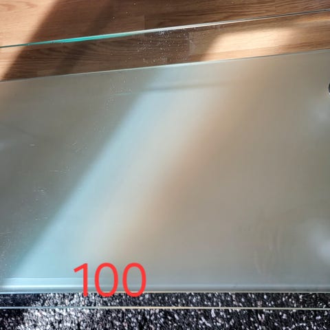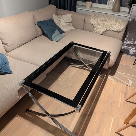 Salongbord i herdet glass. Pent brukt, men med noen synlige riper i glassplaten etter normalt bruk, selges derfor rimeligere.
