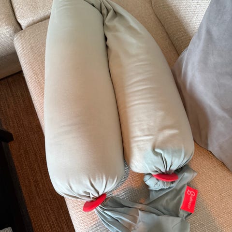 bbhugme gravidpute. Puten er formbar og lang, og kan tilpasses ulike liggestillinger. Egner seg til bruk under graviditet for støtte til mage, rygg, hofter og ben, og kan også brukes som støttepute ved amming eller som kroppsstøtte ved hvile og søvn. Trekket er av mykt tekstilmateriale med knyteender som gjør det mulig å justere fasthet og lengde etter behov.