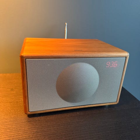 Argon bordradio i trefinish. Kompakt radio med frontvendt høyttaler, display og betjeningsknapper på fronten. Egnet til bruk på bord, hylle eller nattbord i for eksempel stue, kjøkken eller soverom.