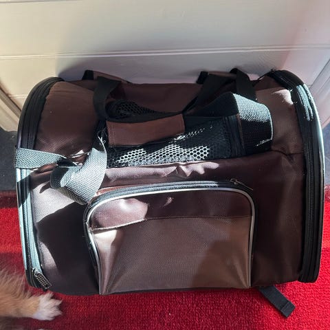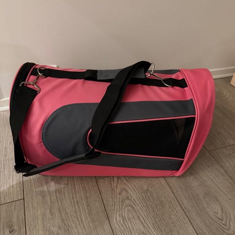 Transportbag for kjæledyr i svart tekstil med nettingpaneler på flere sider for lufting og innsyn. Vesken har både håndtak og skulderreim for enkel bæring. Åpning i front og på toppen med glidelås. Egnet for mindre kjæledyr som hund eller katt ved transport, for eksempel til veterinær eller på reise.