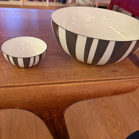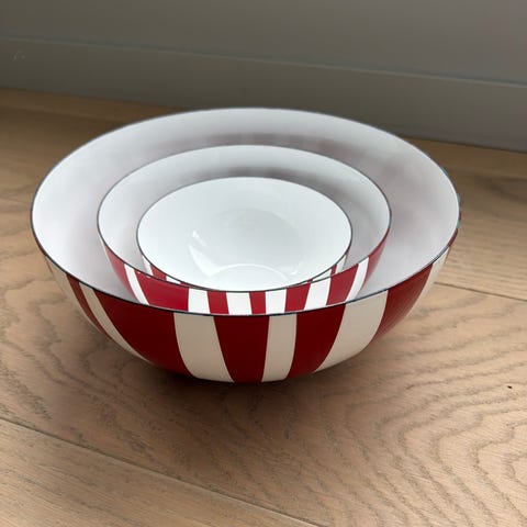Cathrine Holm tre rødstripede boller (10cm, 18 cm og 24 cm) selges samlet Pent brukt