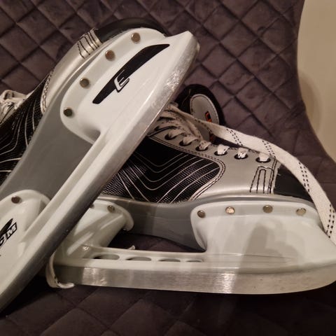 Jofa ishockeyskøyter for barn i størrelse 28. Skøytene har svart overdel med hvite lisser og polstret innside. Understellet er i metall med fastmontert skøytestål tilpasset ishockeybruk. Modellen er egnet for barn som trenger stabile og støttende ishockeyskøyter til bruk på isbane eller skøytebane.