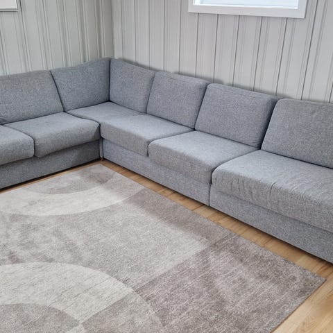 Sofa i mørk grå selges. Den er synelog brukt. Litt falmet i stoffet samt noen flekker. Mye sofa igjen. Kan deles opp