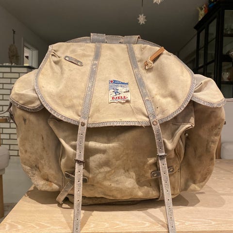 Bergans Original ryggsekk i kraftig lerret med detaljer i lær. Sekken har toppåpning med klaff og spenner, flere utvendige lommer og justerbare skulderremmer. Fargen fremstår som grønn/oliven. Egnet som tur- eller friluftssekk.
