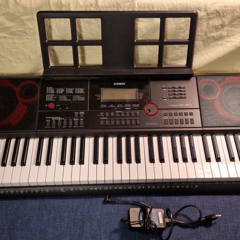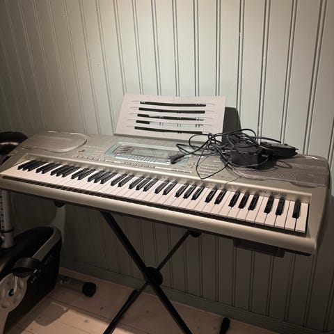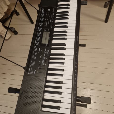 Casio keyboard med innebygde høytalere og notestativ(som lett kan tas av). Følger med et enkelt krysstativ som den kan stå på. Testet før jeg la det ut og alt høres og ser bra ut.