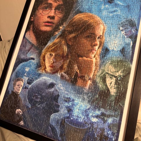 Harry Potter puslespill med collage-motiv av flere figurer og scener fra filmene. Ferdig puslet og montert i ramme. Størrelsen er omtrent 50 x 70 cm, målt med målebånd på bildene. Egner seg som veggdekorasjon for fans av Harry Potter-universet. Materiale er standard puslespillpapp med trykket motiv. Puslespillet er ikke limt fast og kan derfor tas ut og pusles om man ønsker det.