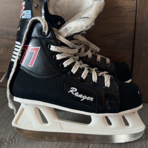 Ranger ishockeyskøyter for barn i størrelse 36. Skøytene har svart overdel med snøring og hvit såle og skøytestål. Egnet til ishockey og annen bruk på is for barn med skostørrelse 36.