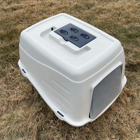 Kattedo med tak og svingdør i grønn og hvit plast.
