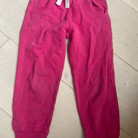 To joggebukser i bomull i lys rosa og vin rød. Størrelse 104. Buksene har strikk og snøring i livet samt ribbekanter nederst på bena for bedre passform. Egnet til hverdagsbruk og lek for barn i aktuell størrelse.
