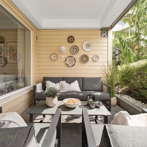 Sofagruppe for balkong eller innglasset veranda i nøytrale beige toner. Gruppen består av sofa med puter, stol, puff/benk og rektangulært bord med glassplate og sorte ben. Kjøpt hos Rusta i 24/25.