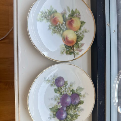 Fruktmotiv små tallerkener porselen hvit med gullkant