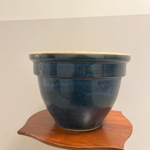 Selger en flott keramikkpotte fra Plantasjen, modell Freja. Potten har en lekker blå/grønn farge med geometrisk mønster og gir et moderne uttrykk som passer godt i stue, gang eller kontor.