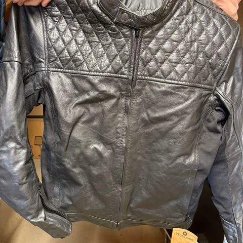 Motorsykkeljakke i tekstil, størrelse 58. Jakken er i hovedsak svart og grå med neongule kontrastfelt for bedre synlighet. Den har perforert innerfôr for ventilasjon og komfort. Flere justeringsmuligheter i livet og ved ermene gir bedre passform. Refleksdetaljer på ryggen og skuldrene øker synligheten i trafikken. Jakken har glidelås og borrelås i front, samt lommer på sidene. Ventilasjonsåpninger på rygg og skuldrene.