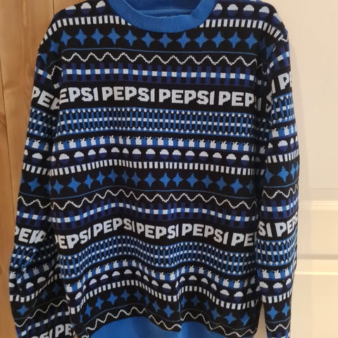 Pepsi vest for herre i størrelse M. Vest i blåtoner med mønster og tekst «Silent Night Yeah Right» og «Pepsi» rundt hele.