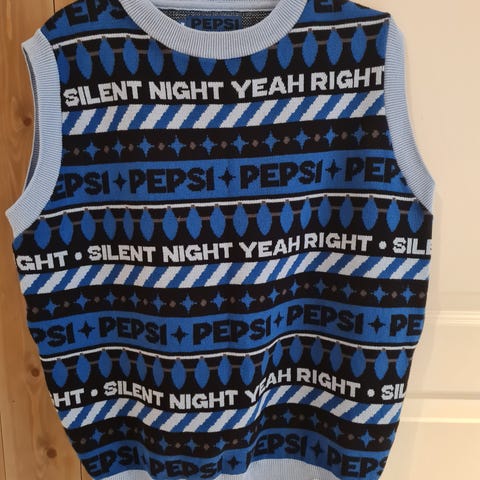 PEPSI genser for herre i størrelse S. Genseren er flerfarget med hovedtoner i blått, svart og hvitt, og har mønster med PEPSI-tekst og geometriske elementer rundt hele.