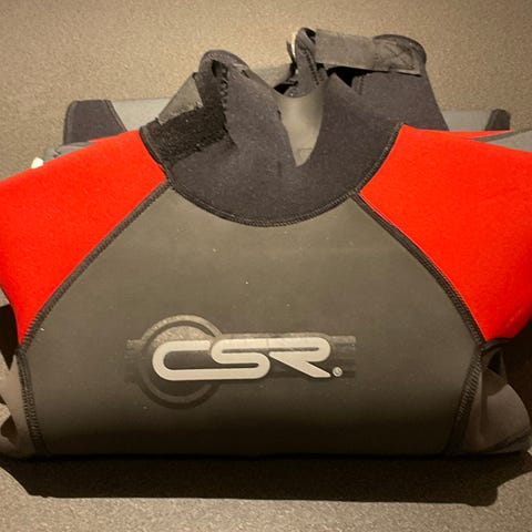 Oneeon junior våtdrakt i størrelse 134 cm, beregnet for barn ca. 7–8 år. Drakten er laget av neopren og nylon. Fargen er rød med mørke kontrastfelt og Oneeon-logo på bryst og ermer. Egnet til bruk i vannaktiviteter der det er behov for isolerende våtdrakt. Ifølge vaskeanvisningen skal drakten skylles i ferskvann etter bruk og ikke oppbevares brettet.